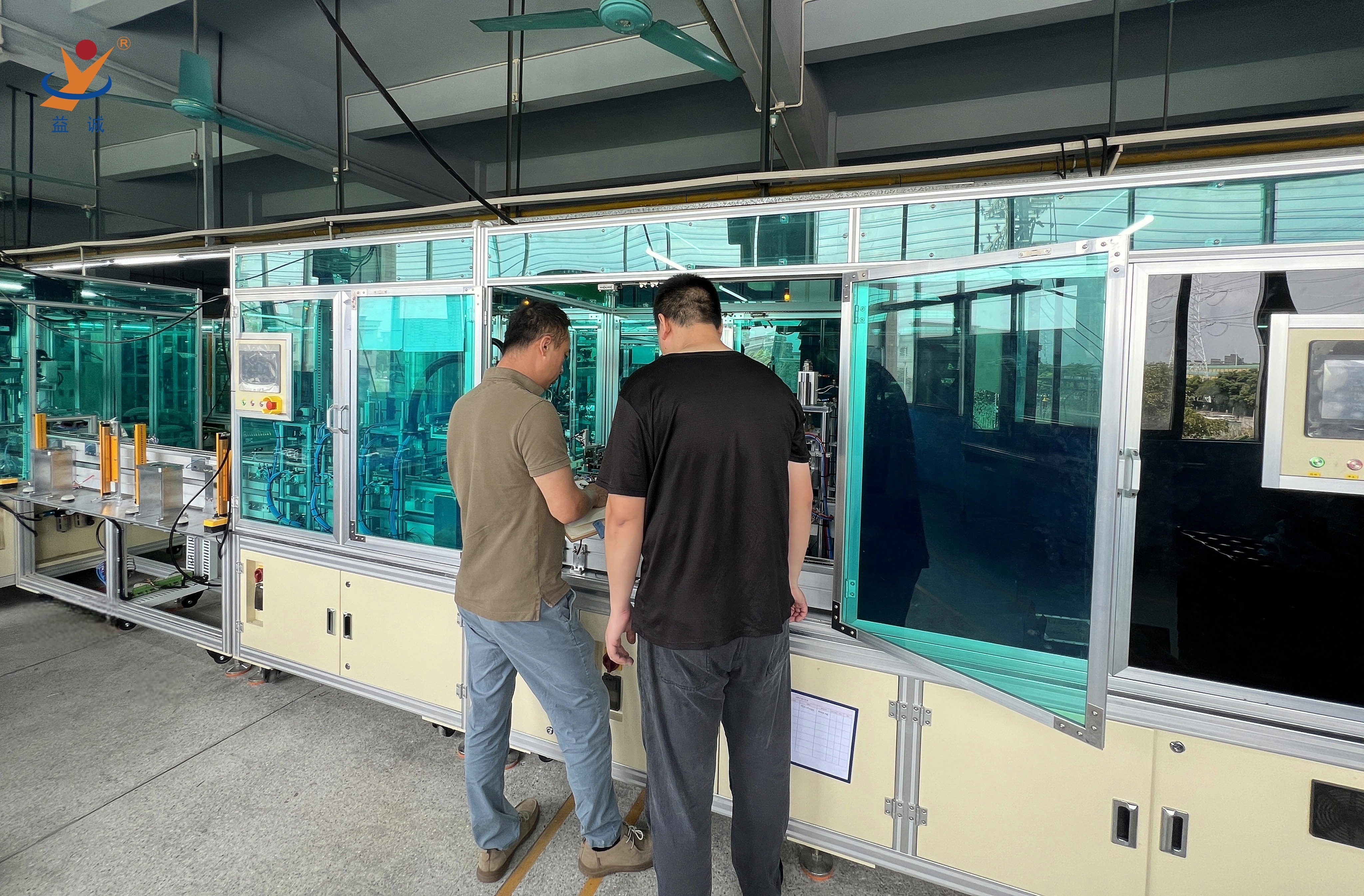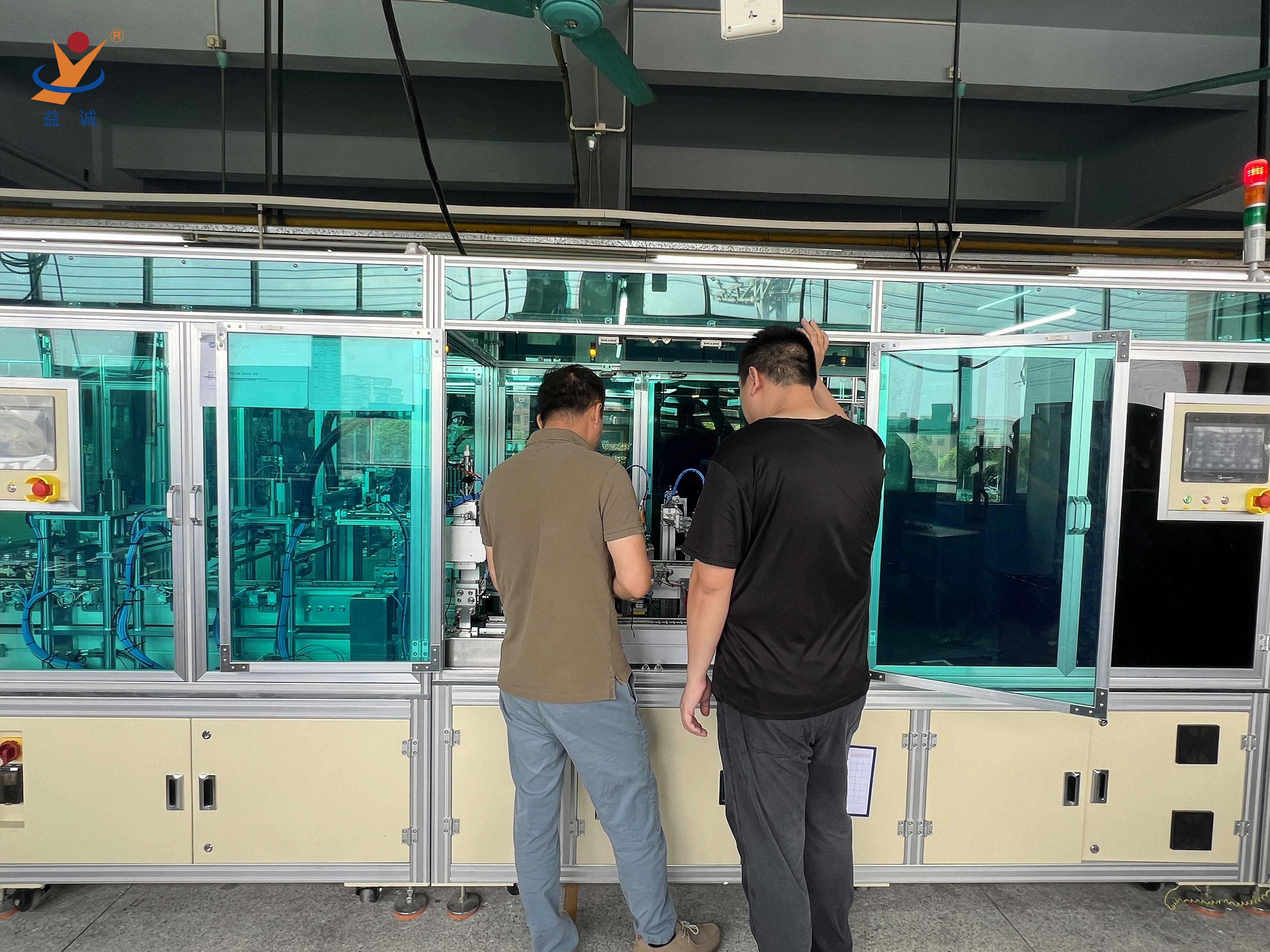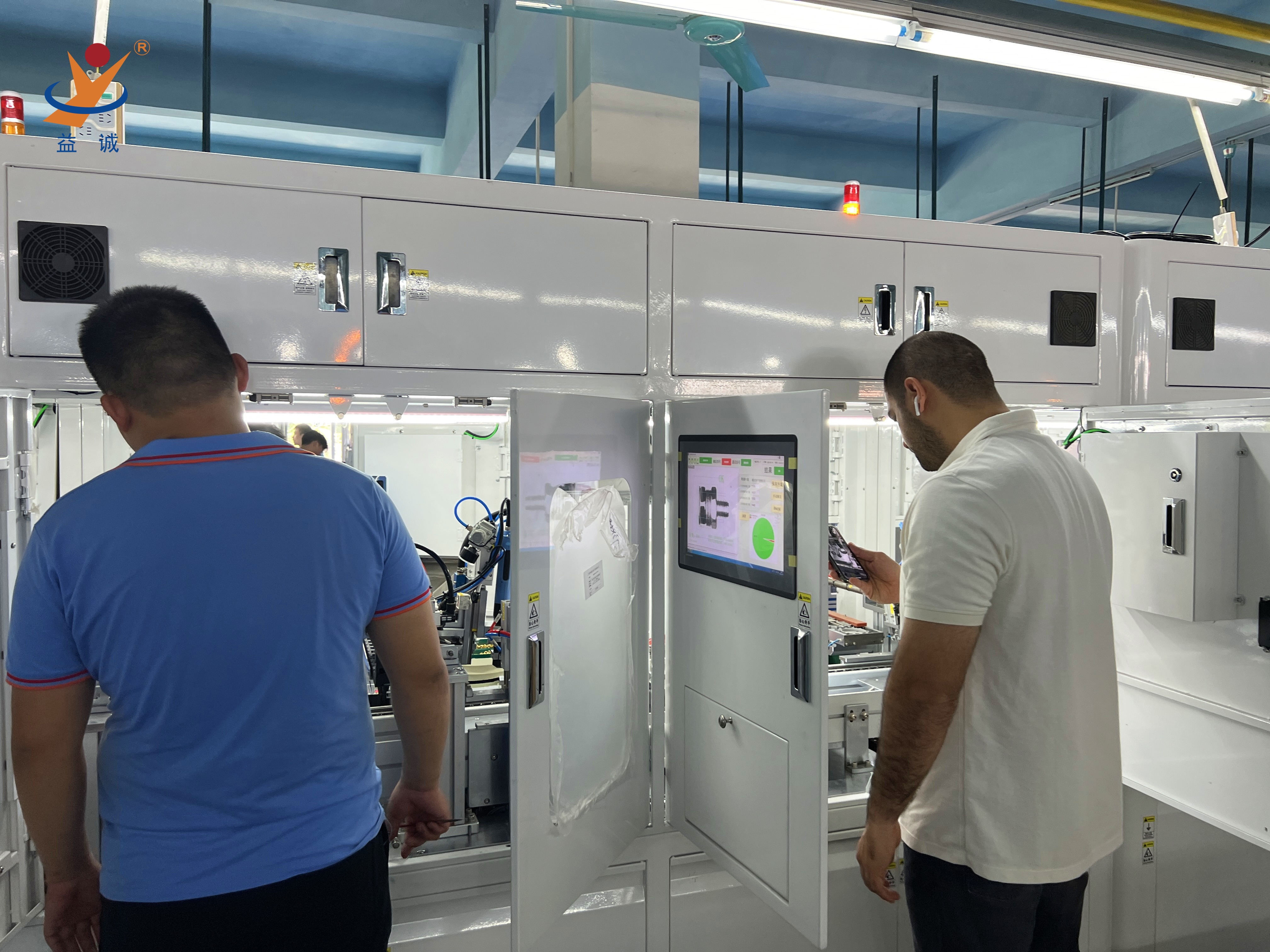 来自法国的客户团队正在现场对高端智能低压电器自动化生产线进行细致地验收,该种类设备是益诚自动化的实力产品之一,是集合高智能、高精度、高产能与实时数据化检测系统等高端技术于一体的高科技自动化生产线。